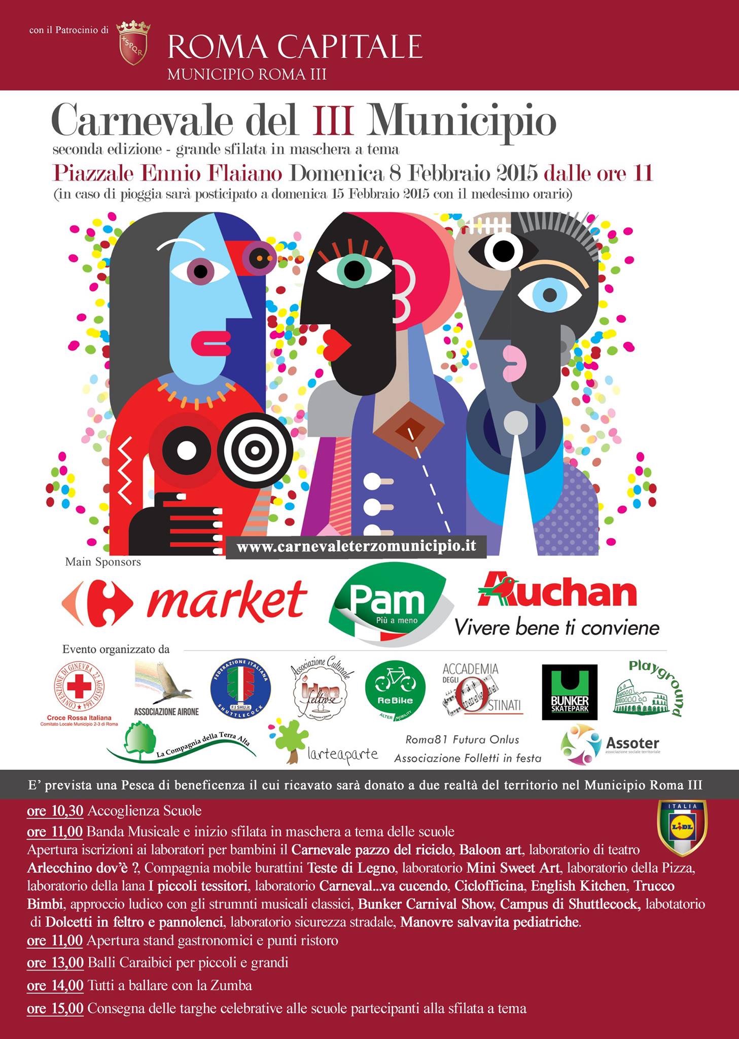 Domenica 8 febbraio a Piazzale Ennio Flaiano dalla mattina fino al pomeriggio si svolgerà il Carnevale del III Municipio : musica, sfilate di maschere a tema organizzate dalle scuole, laboratori creativi in strada e giochi per trascorrere una giornata in allegria nei nostri quartieri