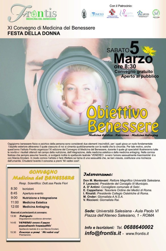 Sabato 5 marzo dalle 8.30 alle 15.30 presso l’Aula Paolo VI dell’Università Salesiana (Piazza dell’Ateneeo Salesiano 1) si terrà il XII Convegno dal titolo “Obiettivo benessere” organizzato da “Frontis” in cui esperti del settore si confronteranno sui temi della Medicina anti aging, del benessere e della nutrizione. Con l’avvicinarsi della Festa della Donna, sarò ben lieta di dare il mio saluto istituzionale in qualità di Presidente del Consiglio del Municipio Roma III ad un’iniziativa che coniuga la salute ed il benessere con la divulgazione e l’aggregazione sociale.
