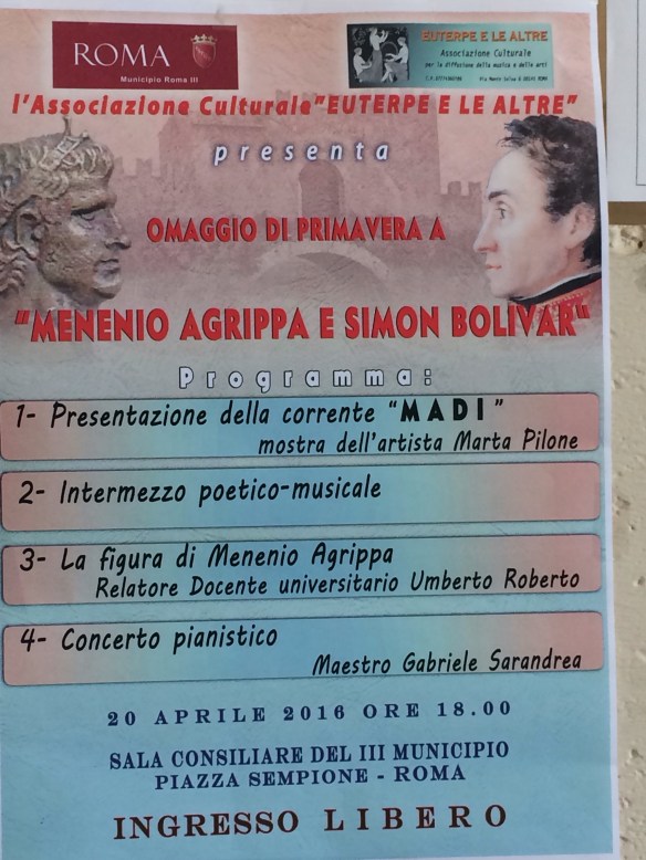 Mercoledì 20 aprile alle ore 18 presso l’Aula Consiliare di Piazza Sempione 15 si terrà l’evento, patrocinato dal III Municipio dal titolo “Omaggio di primavera a Menenio Agrippa e Simon Bolivar”.