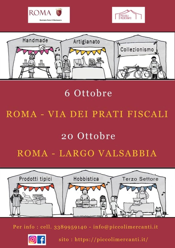 Oggi domenica 6 ottobre dalla mattina fino alle venti di sera, in via dei Prati Fiscali (anti viale di fronte ai negozi) si terrà il primo appuntamento delle mostre mercato sulla via con stand di artigianato, gastronomia e di associazioni sociali e culturali del territorio.