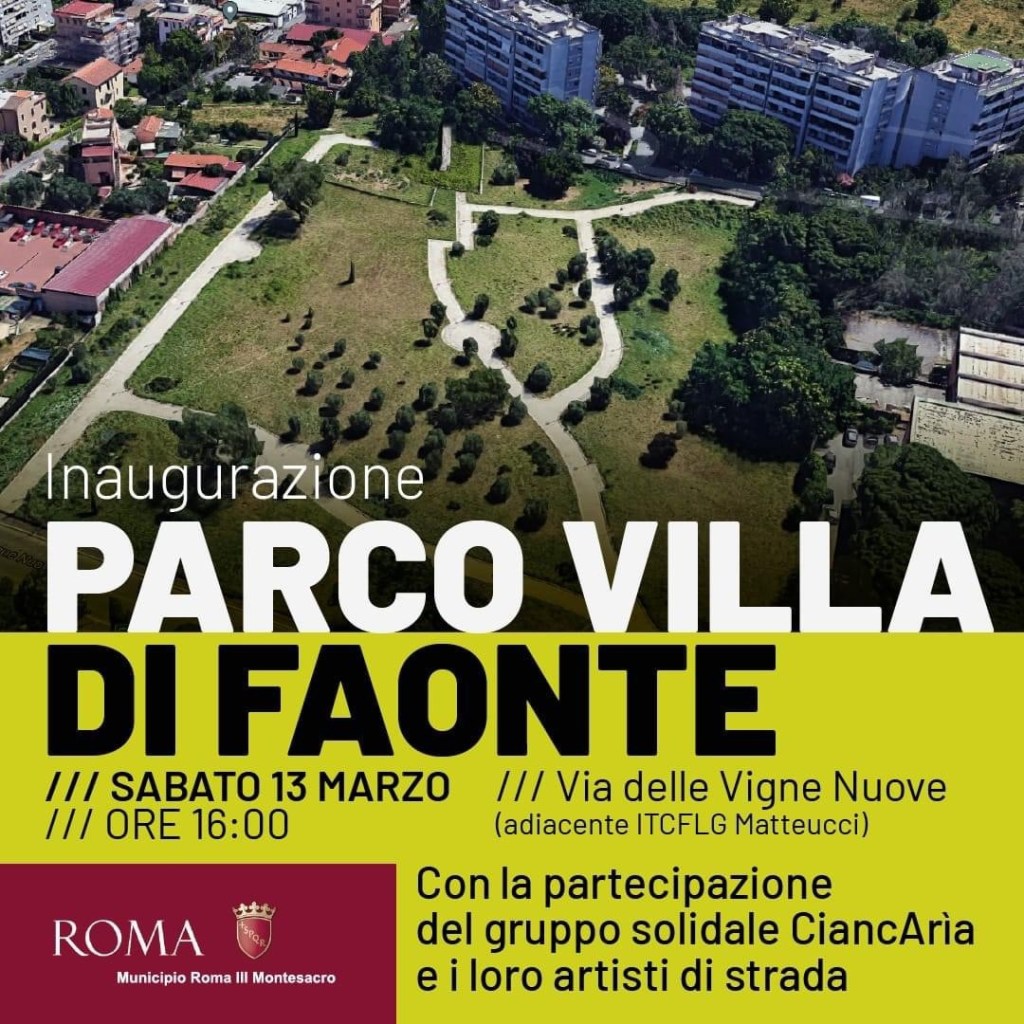 SABATO 13 MARZO ORE 16: INAUGURAZIONE PARCO “VILLA DI FAONTE “ Posted on 13 marzo 2021 by francescaleoncini Oggi pomeriggio alle 16 verrà inaugurato il parco di Faonte in via delle Vigne Nuove. Condividi: Condividi su X (Si apre in una nuova finestra) X Condividi su Facebook (Si apre in una nuova finestra) Facebook Invia un link a un amico via e-mail (Si apre in una nuova finestra) E-mail Stampa (Si apre in una nuova finestra) Stampa Mi piace Caricamento...