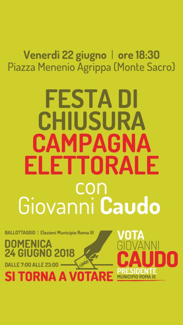 Ma, per assicurare al III Municipio di Roma un’amministrazione più adeguata ed efficiente, dopo i due anni disastrosi anni a guida del M5S, bisogna compiere un ultimo sforzo e tornare a votare domenica 24 giugno al ballottaggio per Giovanni Caudo Presidente.