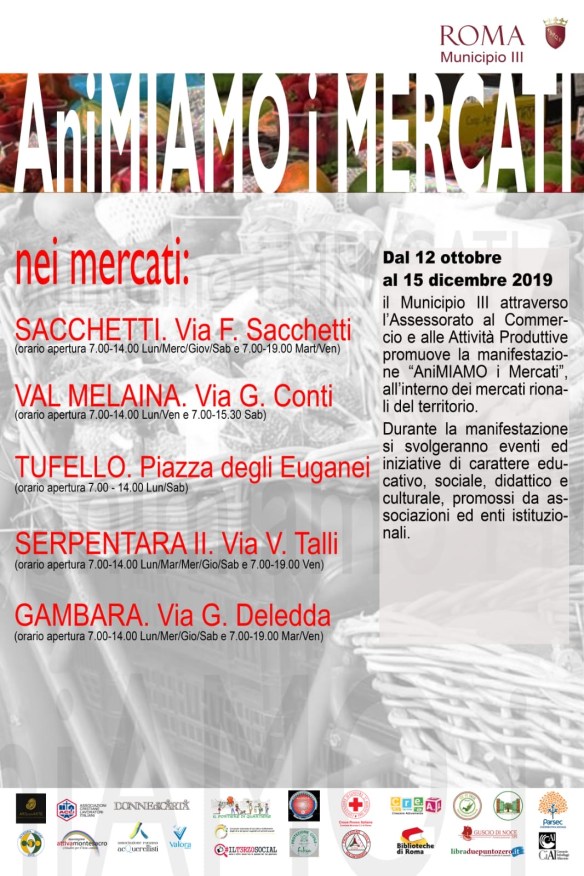 Da domani sabato 12 ottobre fino al 15 dicembre nei mercati rionali parte la manifestazione “AniMIAMO i Mercati”: iniziative didattiche, ludiche e ricreative animeranno gli spazi dei mercati del III Municipio. Grazie al lavoro congiunto delle Commissioni Commercio, Servizi Sociali, Ambiente e Pari Opportunità è stato possibile realizzare il calendario degli eventi in programma fino a dicembre .