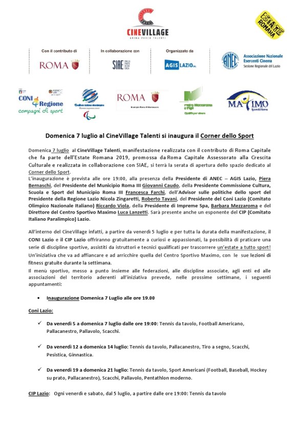 DOMENICA 7 LUGLIO: INAUGURAZIONE CORNER SPORT CONI AL CINEVILLAGE TALENTI