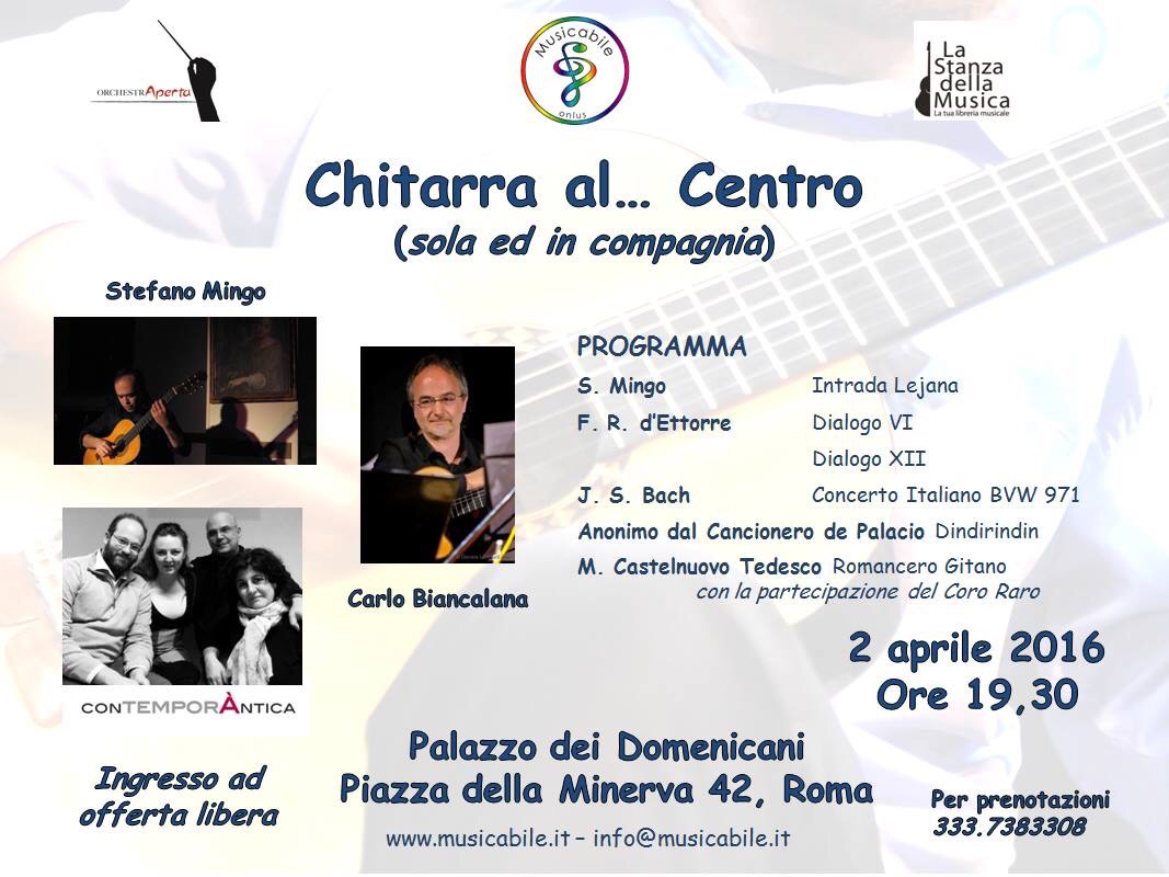 Sabato 2 aprile nella splendida cornice del Convento dei Domenicani a Piazza della Minerva si è svolta la serata finale della rassegna concertistica “Chitarra al centro” organizzata dall’Associazione Musicabile, impegnata da dodici anni nel territorio del III Municipio in attività di musico terapia per i diversamente abili e promotrice del progetto “Orchestra aperta per il III Municipio”. Il concerto di ieri sera ha visto le eccellenti esecuzioni dei maestri Carlo Biancalana e Stefano Mingo accompagnati dal “Coro raro”. La rassegna è legata alla seconda edizione del Concorso chitarristico internazionale “Corrado Alba – Musicabile onlus” le cui iscrizioni si sono chiuse ieri sera e sarà patrocinato dal III Municipio, come l’edizione di due anni fa. I fondi raccolti durante la serata sono stati devoluti all’Associazione ” A roma insieme – Leda Colombini” impegnata nell’assistenza delle madri detenute e dei loro bambini.
