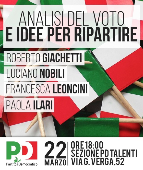 Giovedì 22 marzo alle 18 presso la sezione PD Talenti in via G. Verga 52 insieme a Roberto Giachetti e Luciano Nobili faremo l’analisi del voto delle ultime elezioni e parleremo delle idee per far ripartire il Partito Democratico in Italia e a Roma.