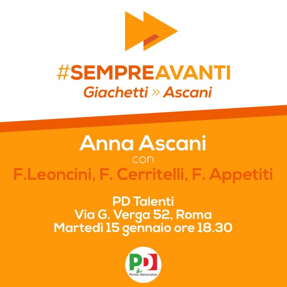 Domani martedì 15 gennaio alle 18.30 presso la sezione PD Talenti (Via G. Verga 52) Anna Ascani presenterà la mozione “Sempre Avanti” a sostegno della candidatura di Roberto Giachetti alla Segreteria Nazionale del Partito Democratico.