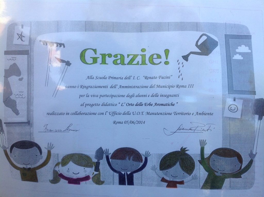 “Il 5 giugno nel corso della Festa di fine anno della scuola primaria dell’I.C. RENATO FUCINI nel quartiere Talenti in III Municipio i bambini delle classi che hanno partecipato al progetto dell’orto didattico piantumato lo scorso 13 maggio nel cortile della scuola hanno visto il loro impegno premiato dall’istituzione municipale” lo comunicano in una nota i consiglieri PD Francesca Leoncini e Fabio Dionisi, rispettivamente Presidenti delle Commissioni Ambiente e Urbanistica e Lavori Pubblici e Mobilità del III Municipio di Roma Montesacro “Alla presenza del dirigente scolastico Marina Esterini, dell’Assessore alla Scuola del III Municipio Pierluigi Sernaglia e dei rappresentanti dell’UOT del III Municipio che hanno curato la realizzazione del progetto, Arch. Susanna Rizzuti e dott.ssa Lucia Amodio, i bambini hanno ricevuto dalla consigliera Francesca Leoncini un attestato di riconoscimento per il loro impegno in favore del rispetto e della tutela dell’ambiente, dopo aver esposto davanti a genitori e insegnanti il progetto dell’orto didattico. Un impegno che ha coniugato didattica ed educazione ambientale e che proseguirà anche durante l’estate attraverso turni di innaffiamento e cura dell’orto, a cui parteciperanno attivamente anche i consiglieri della Commissione Ambiente del III Municipio, convinti sostenitori dell’iniziativa”