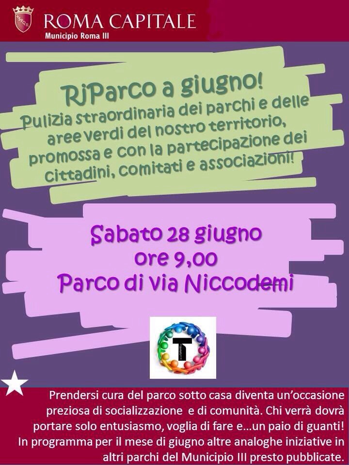 Domani sabato 28 giugno a partire dalle 9 insieme a tanti cittadini volontari parteciperò alla pulizia dei giardini di via Niccodemi a Talenti.